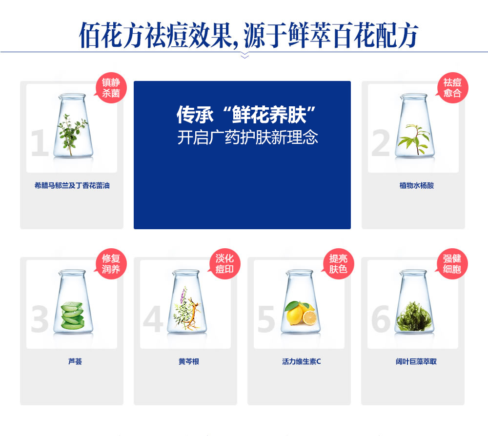 廣藥白云山敬修堂佰花方研究所聯合美國休斯醫學研究所HHMI研發祛痘科技。重新疏通肌膚微循環、分解吞噬現有斑點,營養修護,打造祛痘的解決方案。