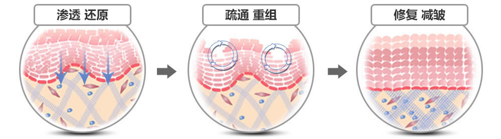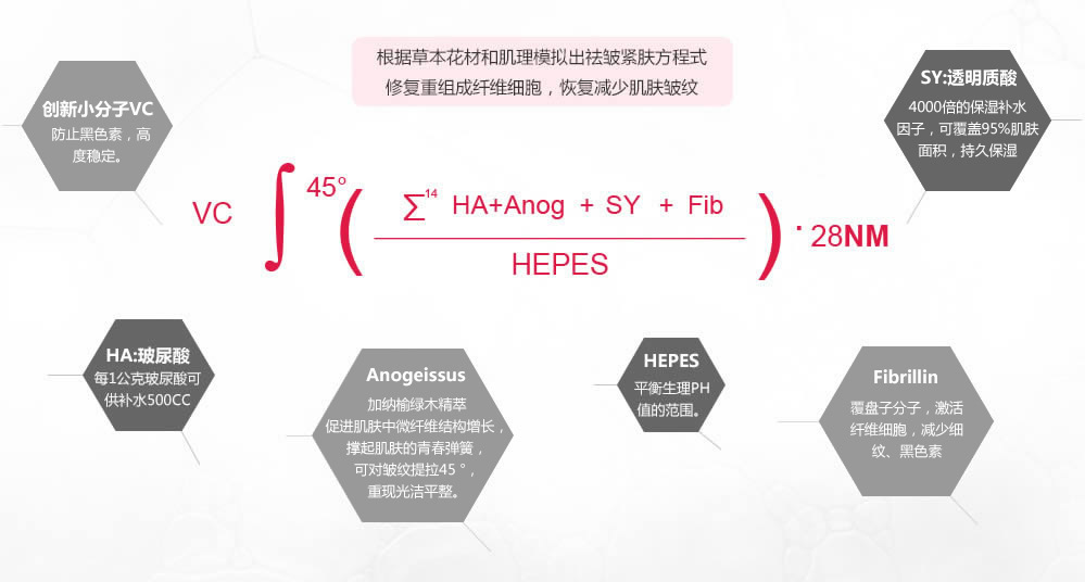 創新納米活力VC,滲透發揮功效,提高纖維細胞功能,還原肌膚內部成纖維活性動力。